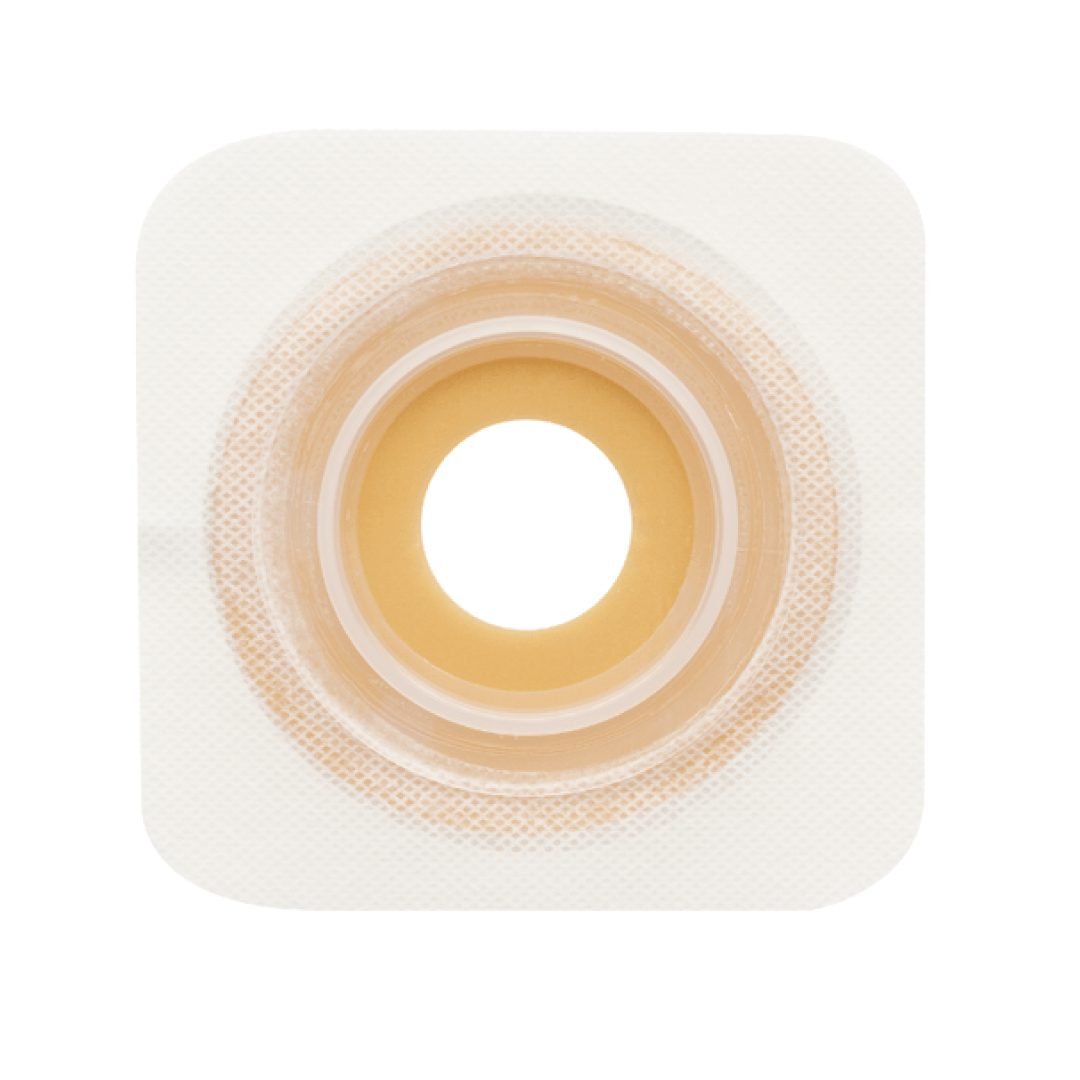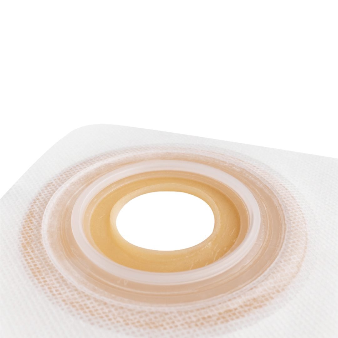 Barrera cutánea plana sistema de ostomía Natura, con disco de hidrocoloide adhesivo. La superficie adhesiva de contacto con la piel está protegida con una placa de silicón. El adhesivo trilaminado tiene Durahesive™ del lado de donde se moldea la barrera cutánea. La barrera se ajusta al tamaño y forma del estoma sin tijeras.